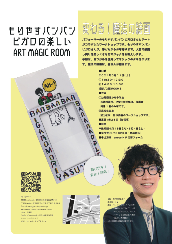 パフォーマーのもりやすバンバンビガロさんとアートがコラボしたワークショップです。もりやすバンバンビガロさんが、子どもからお年寄りまで、人前で披露し周りを楽しくさせるマジックをお教えします。今回は、あつがみを使用してマジックのタネを作ります。魔法の絵画は、皆さんが描きます。