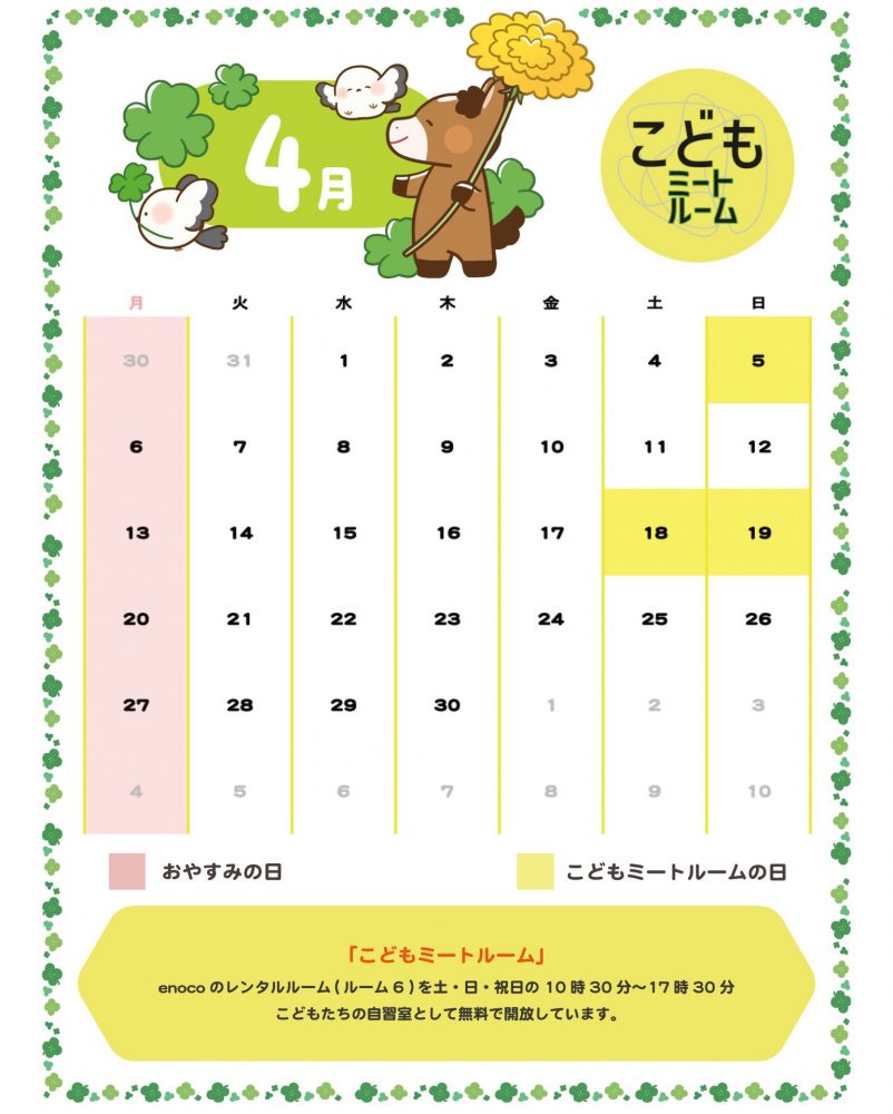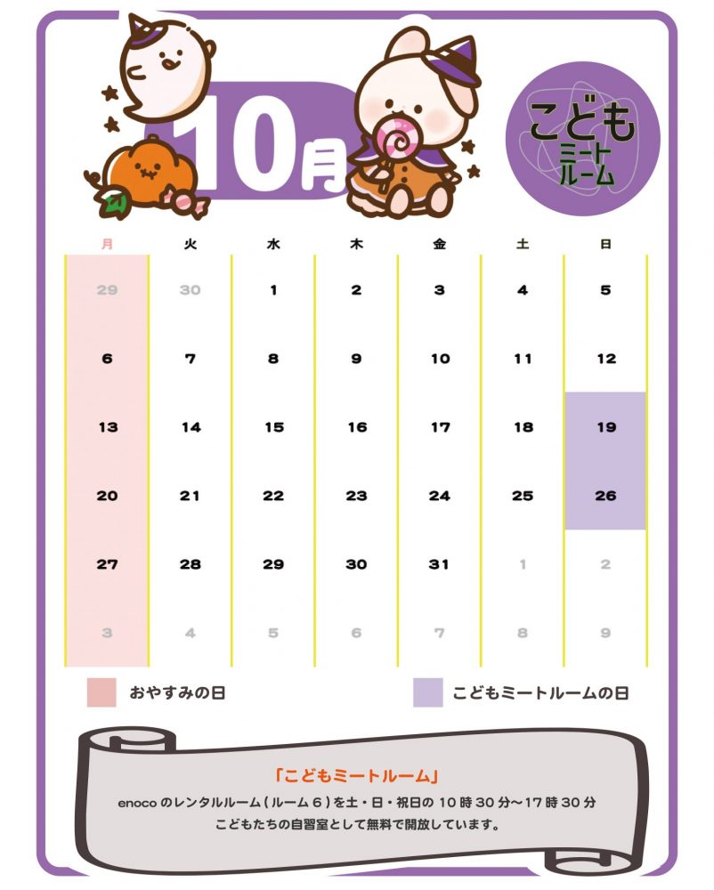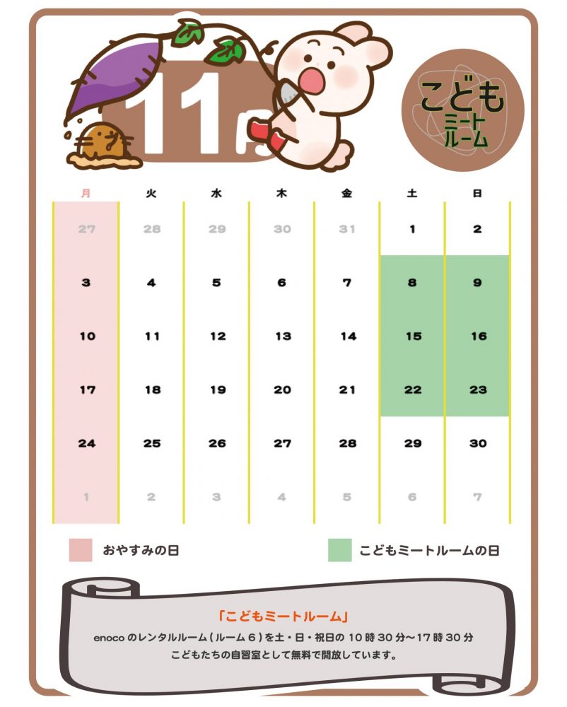 2022年11月6日より、enoco のレンタルルーム( ルーム6) を土・日曜日・祝日にこどもたちの自習室として無料で開放しています。