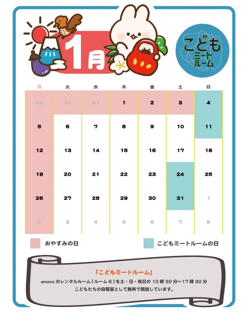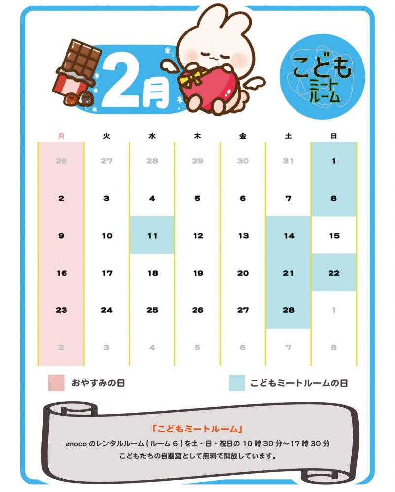 2022年11月6日より、enoco のレンタルルーム( ルーム6) を土・日曜日・祝日にこどもたちの自習室として無料で開放しています。